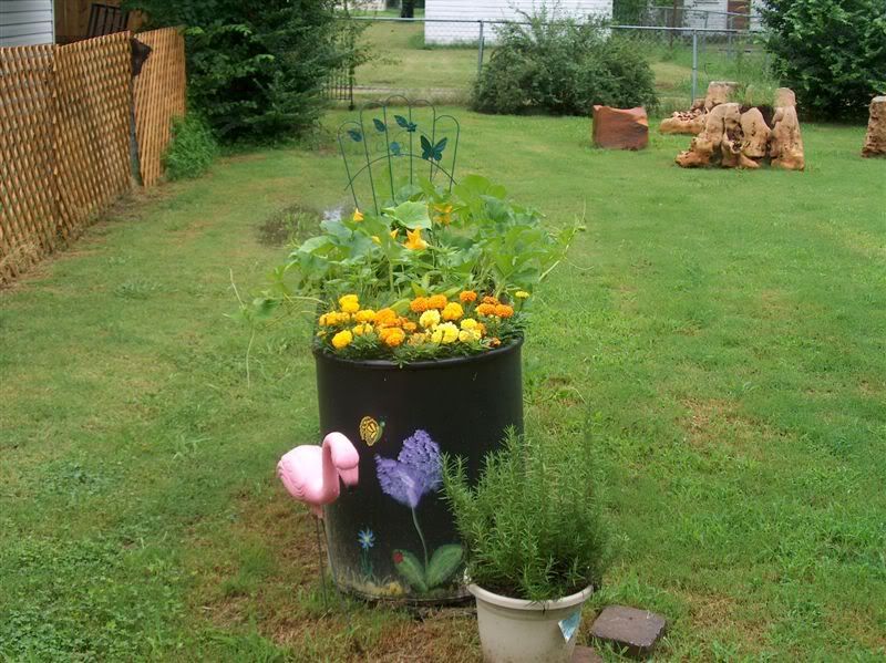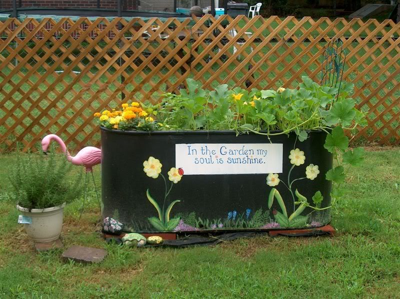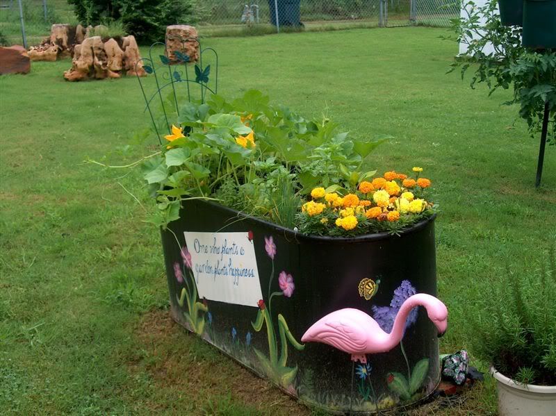 Now, here's my garden. This was once a galvanized metal cattle trough I bought from a Farm-supply store. It fortunately already had a drain hole. I painted it with outdoor acrylics, and filled it with a combination of garden soil and compost. The flamingo is a Katrina survivor; the potted plant next to the garden is rosemary. I have marigolds, basil, chives, oregano, sage, peppers, spaghetti squash and cucumbers planted, but the spaghetti squash has taken over everything, just about! (I'd originally meant to plant it in a separate container, but that didn't happen.)